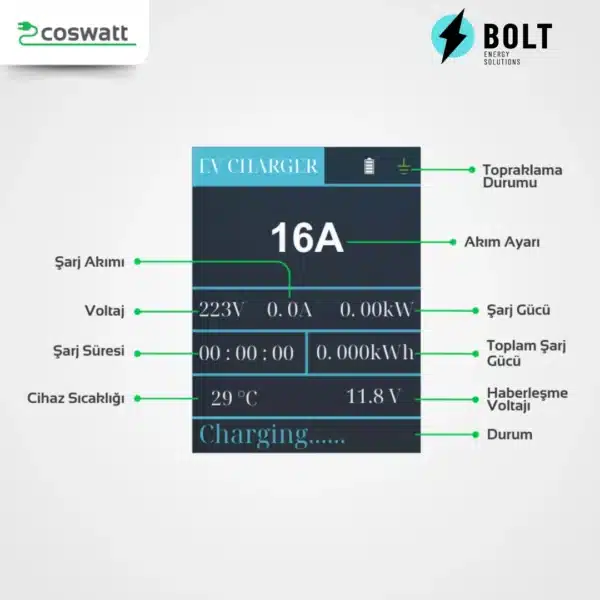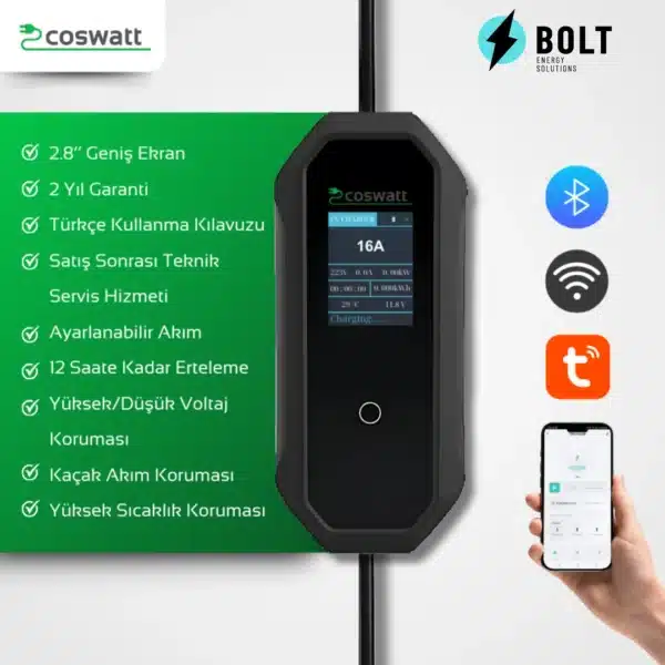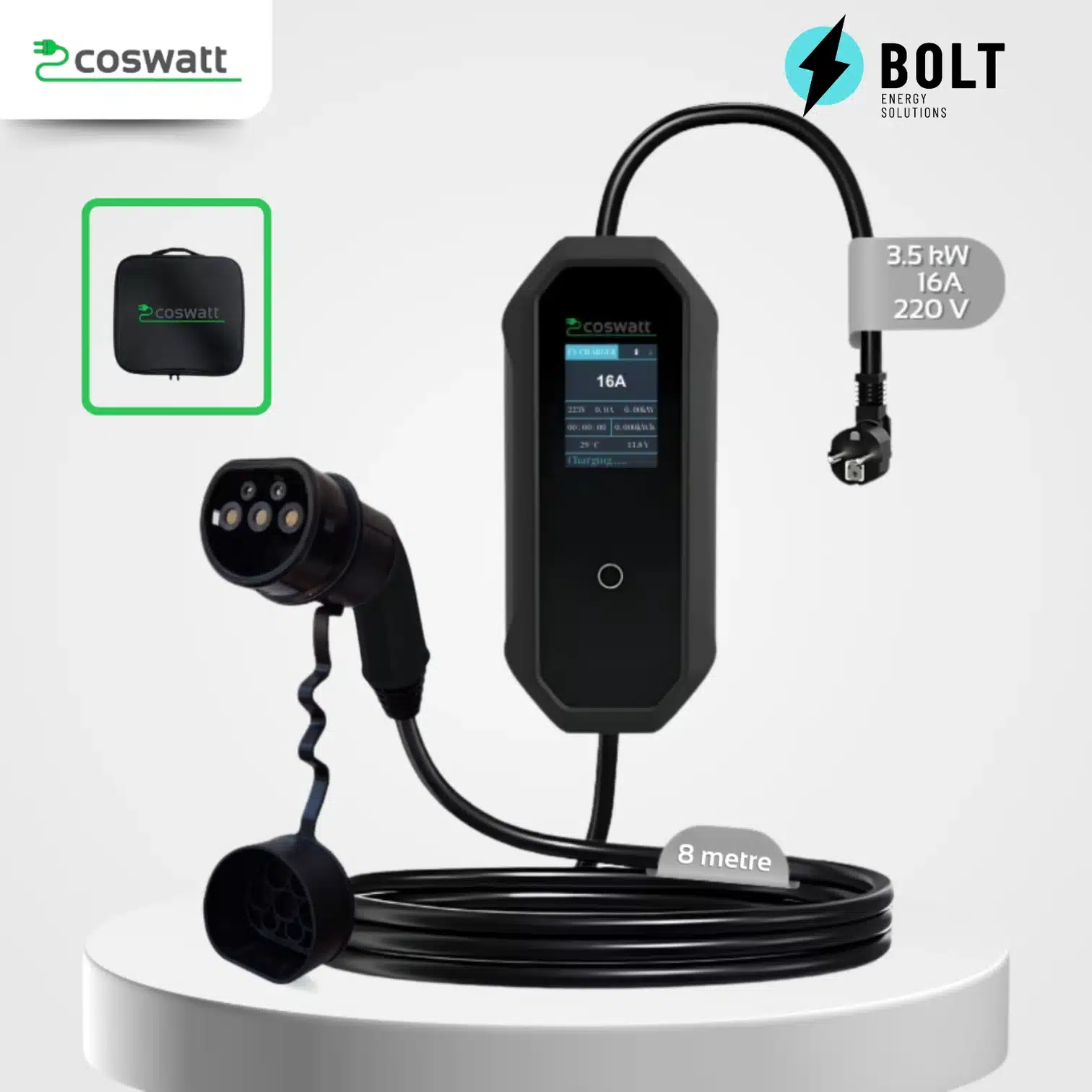 Coswatt Taşınabilir Şarj Cihazı 3.5 kW / 16A / Türkçe Menü / 8m veya 12m Kablolu / Tip-2 / Ev Tipi Schuko Fiş / 220V AC / Taşıma Çantası Hediyeli
