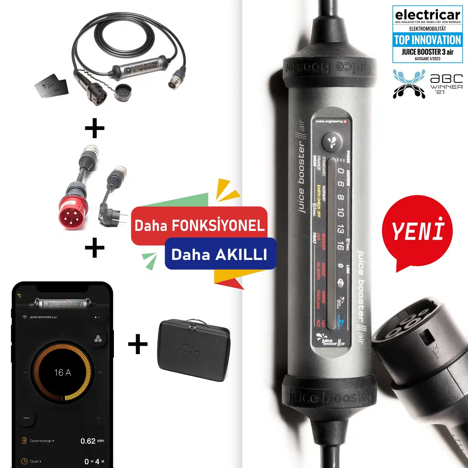Juice Booster 3 Air Basic Set, elektrikli araç sahipleri için taşınabilir, akıllı ve güçlü bir şarj çözümü sunar. Kompakt tasarımı, 11 kW’a kadar şarj gücü ve dünya çapında her türlü prize uyum sağlayan adaptörleriyle, aracınızı evde, yolda veya tatilde güvenle şarj edebilirsiniz. Tip 2 uyumlu bu şarj istasyonu, modern teknoloji ve sağlamlığı bir arada sunuyor.